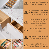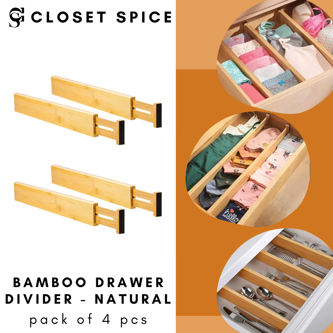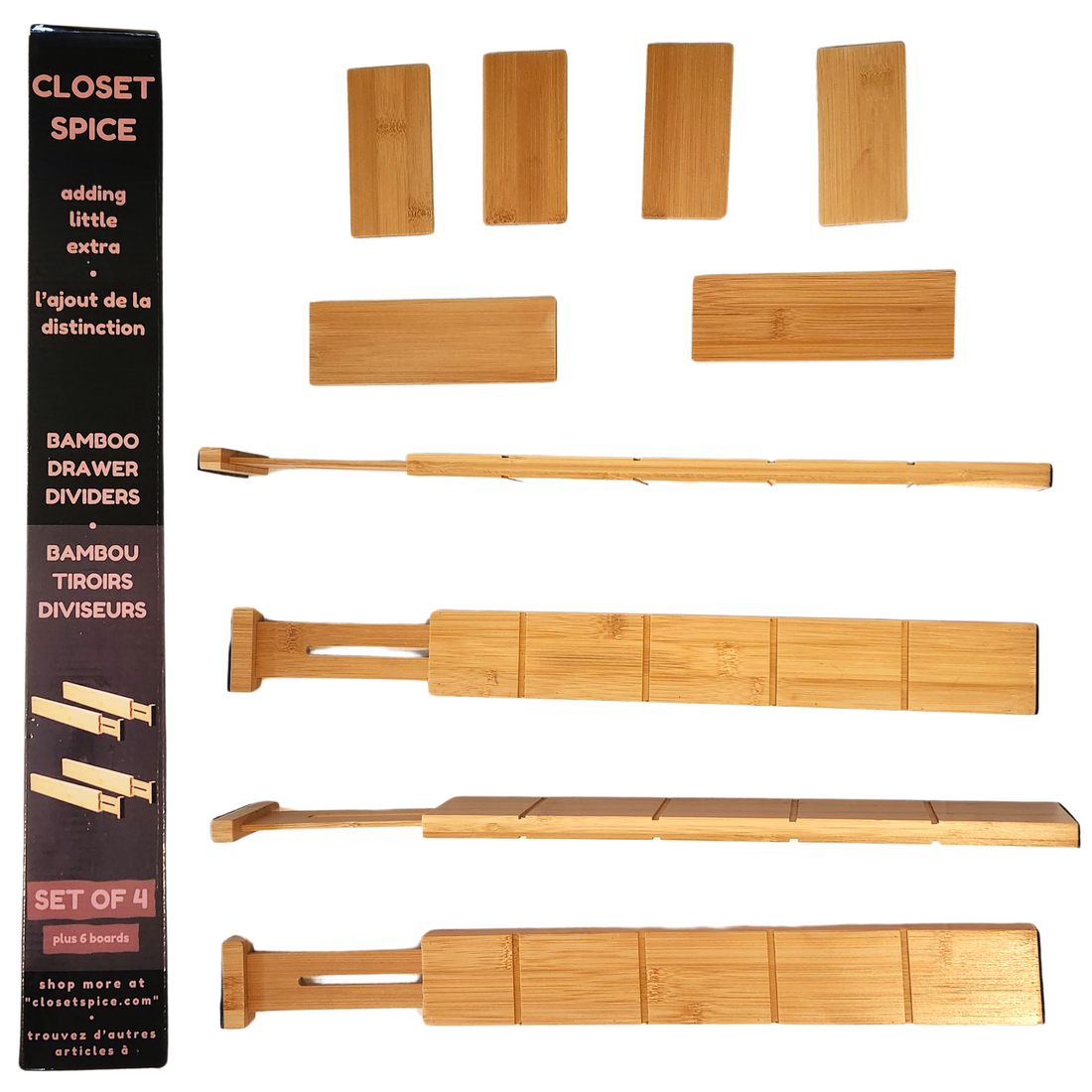 This set of 4 Bamboo Expandable Drawer Organization with 6 Dividers from Closet Spice™ is an effective solution to improve the sometimes-chaotic situation inside your drawers. This organizer set works by dividing and sectioning your drawer according to your preferences. Made from bamboo and sporting a versatile natural finish, each bamboo drawer divider features a high quality spring-loaded mechanism that allows you to adjust and install it with ease, making them perfect for small or large drawers. Use these dividers to keep your drawer contents easy to see and easy to reach.